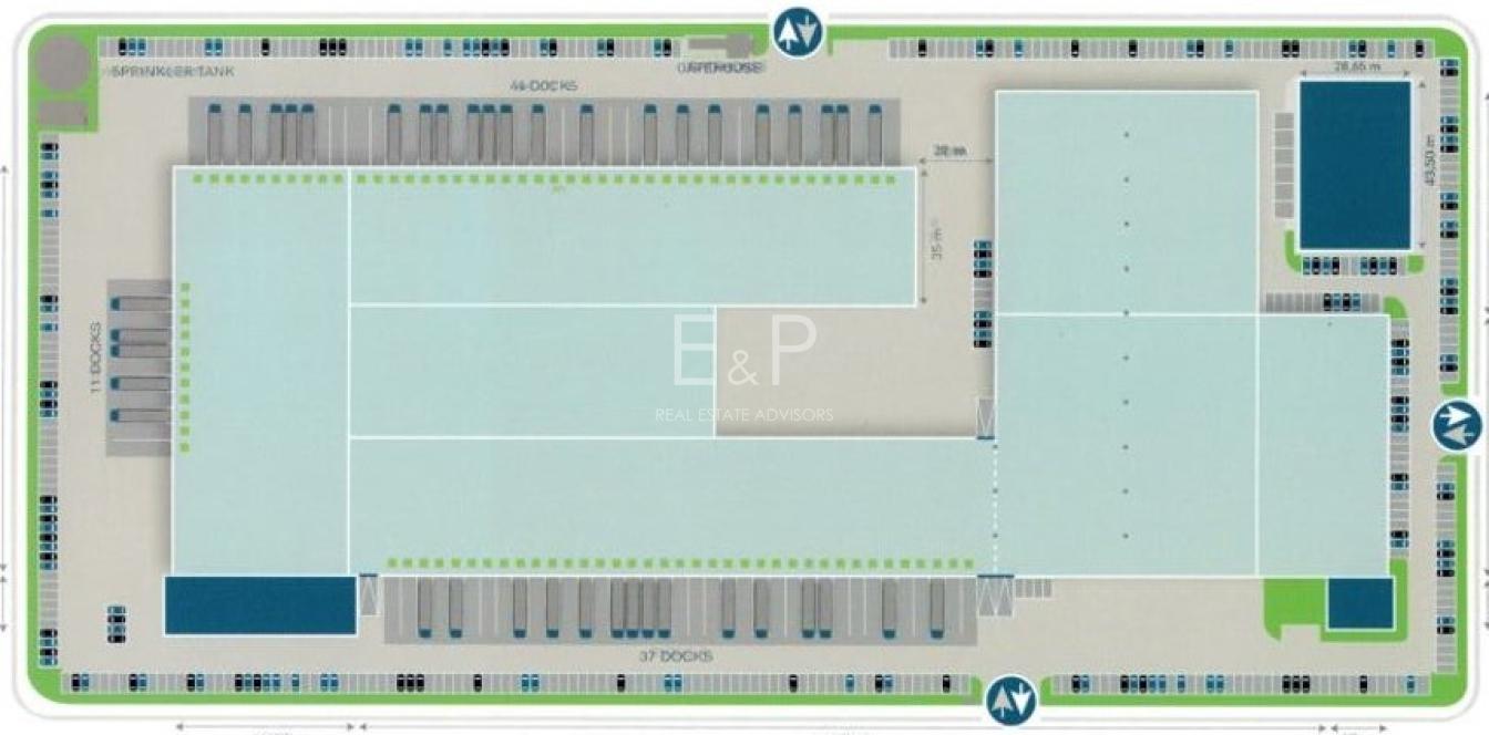 PCI Riego Alto Medio 5. (posibilidad adaptar Alto 8). Estructura y cerramiento de hormigón. Solera de hormigón de alta resistencia. 6 Tn/m² puntual 8 Tn/m². Planimetría solera: FM2 FF45 FL35. Playa de Maniobras: 34 m dentro de un recinto vallado. Crujía Estructura: 12,5 x 25 m Rociadores: ESFR K25 (según norma NFPA) Iluminación LED 4% luz natural. 154 Parking Vehículos. Cargadores eléctricos: 7 Parking Bicicletas: 2 Potencia Eléctrica: 35 W/m² Fotovoltaica: 100 kW por edificio. ESFR Sprinkler System Seguridad 24 horas Caseta de vigilancia y Control de accesos.