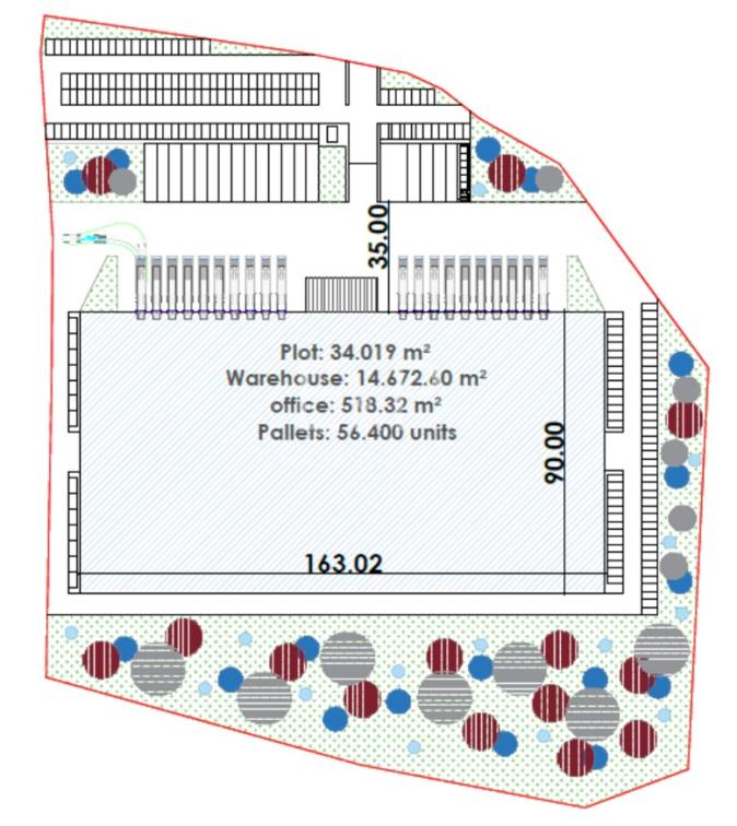 Altura Libre: 11,50 m Sobrecarga solera 6 Tn. (puntual vs Unitaria) Planimetría solera: FM2 FF45 FL36 Muelles: 18. Playa de maniobra: 35 m Parking: 221 (turismos) Crujía Estructura: 12 x 24 m Rociadores: ESFR K25 (según norma NFPA) Iluminación: LED – conectado todo a BMS.50 LUX. 500 LUX en zona de trabajo de oficinas. Riesgo Medio 5 Cargadores eléctricos: 10. Parking Bicicletas Potencia Eléctrica 3MW Fotovoltaica 100 Kw por edificio Capacidad almacenaje Palets: 52.812 unidades.