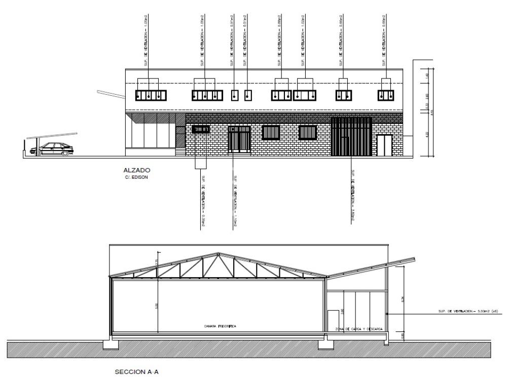 Portones: 3 (carga a nivel) Suelo hormigón pulido Lucernarios Luminarias Altura: 6 metros Cubierta de chapa Extintores Aseos Estanterías Cámaras frigoríficas: 2 Patio lateral y trasero Oficinas con Entrada independiente Suelo de terrazo Dos despachos Pequeño trastero